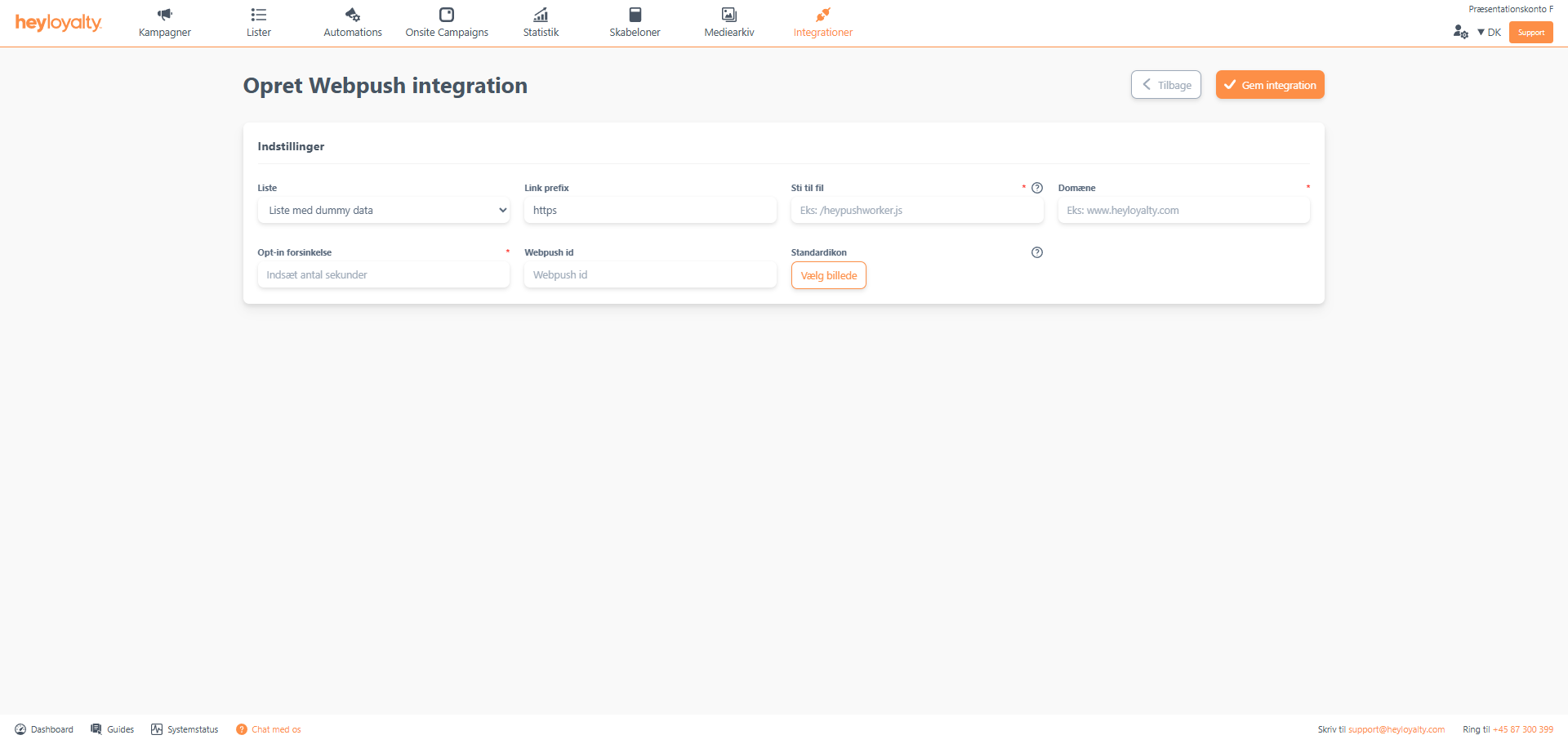 Fill in the fields. Make sure to fill in File path with an exact name. Heyloyalty strongly recommends that you enter /webpushworker.js here. Opt-in delay is typically 5 seconds. It defines how many seconds a user must be on your website before the option to sign up for web push notifications on your website appears.