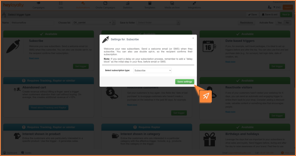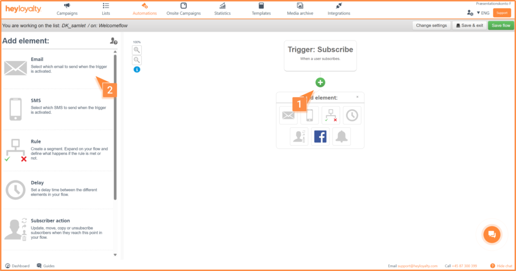 Setup your welcome flow by clicking Automations –> Create new automation –> Create automation flow.
