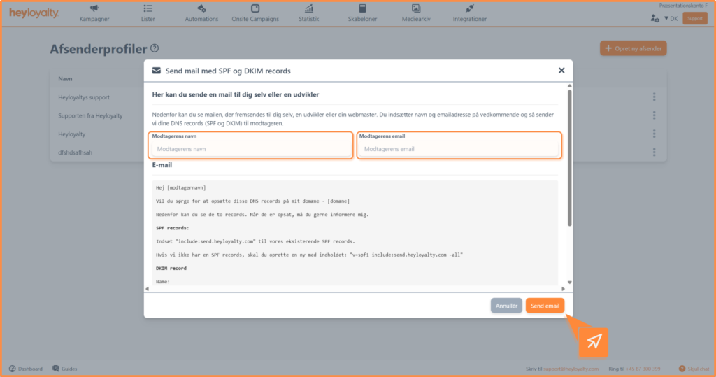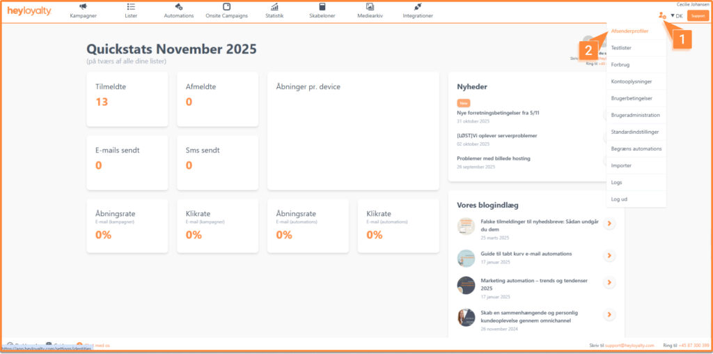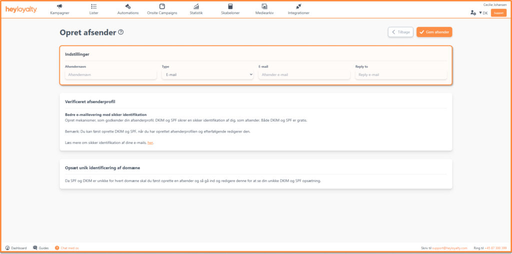 I denne guide får du en stepguide på, hvordan du sætte din afsenderprofil op. Det er vigtigt du får sat en afsenderprofil op, da det er obligatorisk i Heyloyalty, for at du kan sende e-mails. Afsender profilen bruges som afsenderoplysninger, når du sender mails eller SMSer.