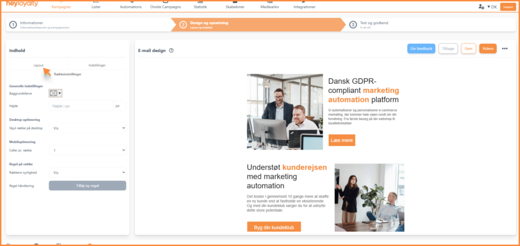 Du kan altid tilføje nyt indhold til din kampagne. Dette gøres via fanen Layout. Hvis du befinder dig i indstillingerne for en række eller celle, har du altid adgang til Layout, hvor du finder alle indholdselementerne.
