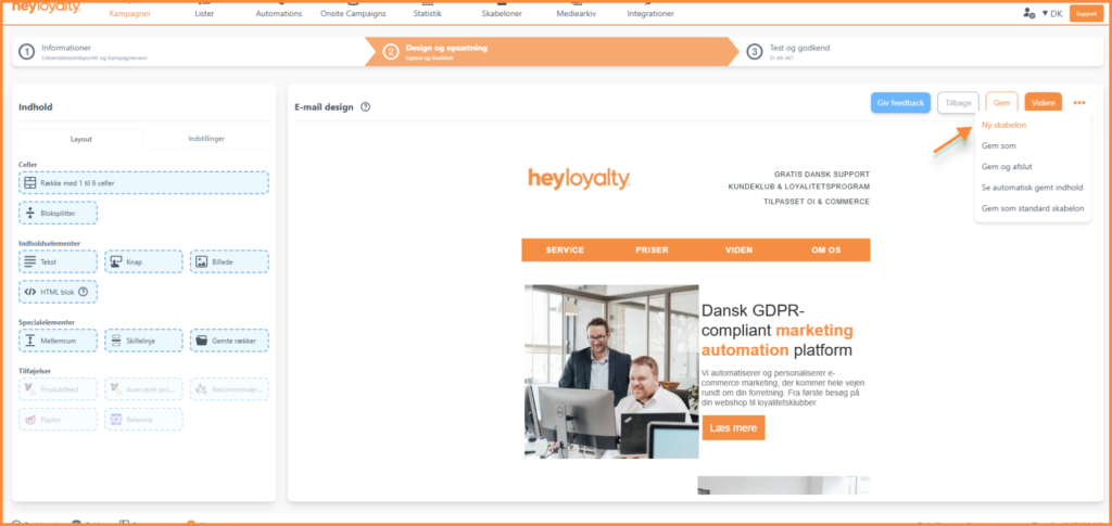 Når du er færdig med opsætningen af din e-mail, anbefaler vi, at du gemmer dit indhold og går videre til step 3, hvor du kan teste e-mailen og forberede den til udsendelse.