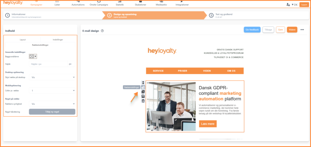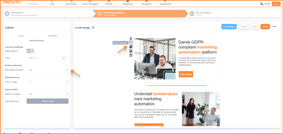 I den nye editor har du nu fuld kontrol og kan selv vælge, om en række skal være synlig på desktop eller ej. Det gør du nemt under Rækkeindstillinger > Desktop-optimering.