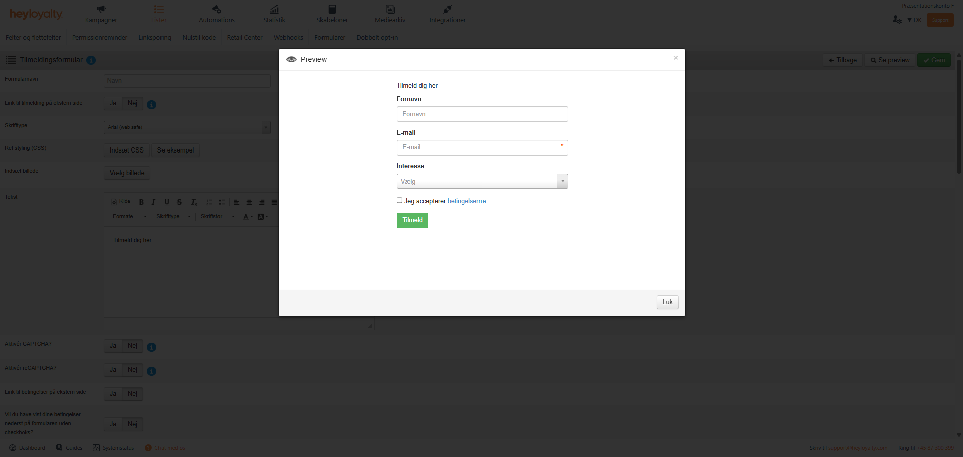 Når du har udfyldt informationerne samt forholdt dig til hvilke felter, der skal vises i formularen, kan du i toppen klikke på Se preview og få en forhåndsvisning af din formular. Klik Luk og derefter Gem, hvis du er tilfreds med din formular.
