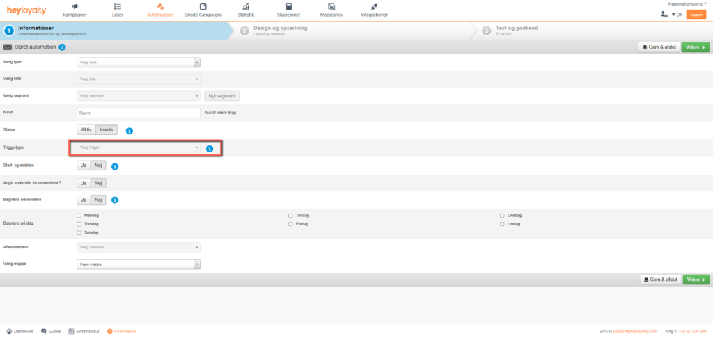 Under triggertype vælger du Tracking. Så får du en masse ekstra muligheder for at vælge en Handling. Vælg fx handlingen Tabt kurv. Udfyld resten af informationerne. Klik Videre.