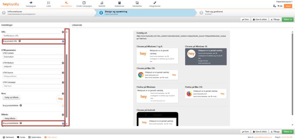 Modsat en webpushkampagne, kan du ved en automation automatisk hente et billede og et link fra dit produktfeed. Du kan altså eksempelvis opsætte en tabt kurv med webpush på samme måde som du kender det fra e-mails, hvor denne webpushautomation automatisk henter et billede og et link fra dit produktfeed og sætter det ind, så denne automation linker ind til præcis det produkt, som gæsten efterlod i kurven. For at bruge denne funktion, skal du scrolle ned og sætte flueben i Brug produkt URL under URL, og ved Brug produktbillede under Billede.