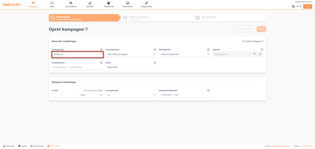 Opsæt din pushkampagne ved at klikke på Kampagner –> Opret ny kampagne –> Kampagnetype –> Webpush.