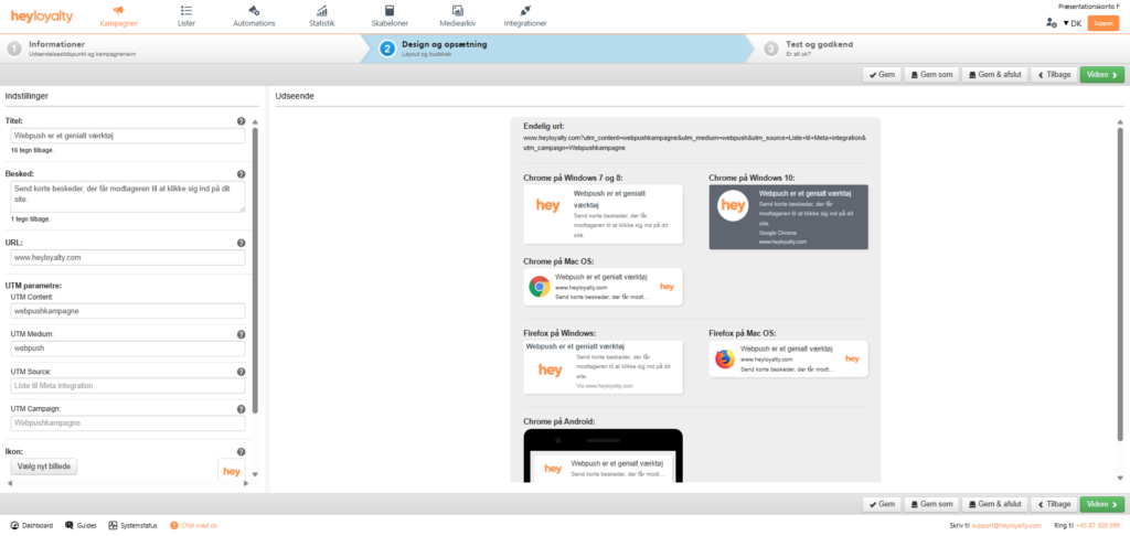Vær opmærksom på, at din webpushkampagne vil se en anelse forskellig ud afhængig af, hvilken browser beskeden bliver vist i. Når du er tilfreds med designet, klikker du Videre, hvor du kan se et overblik over din kampagne samt har muligheden for at teste den url, din webpushkampagne linker hen til.
