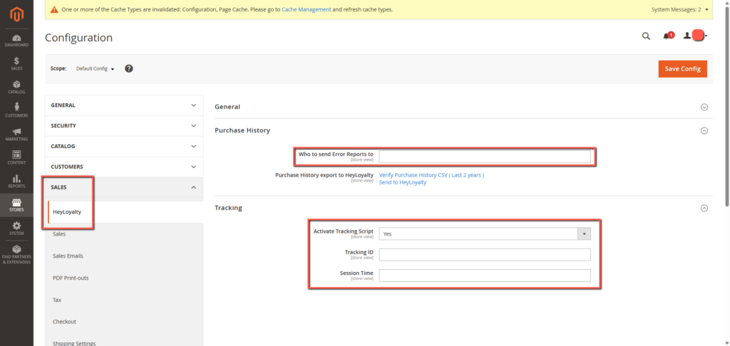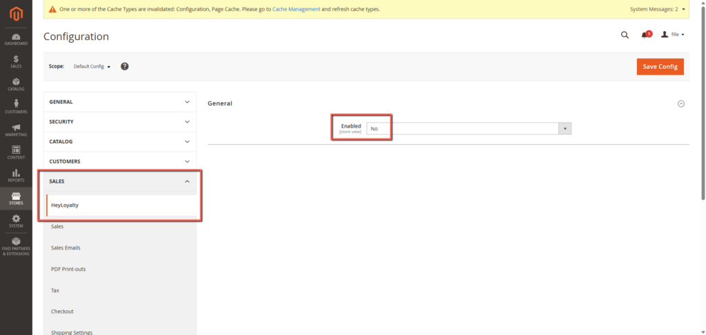 Klik på Stores –> Configuration–> Sales –> Heyloyalty