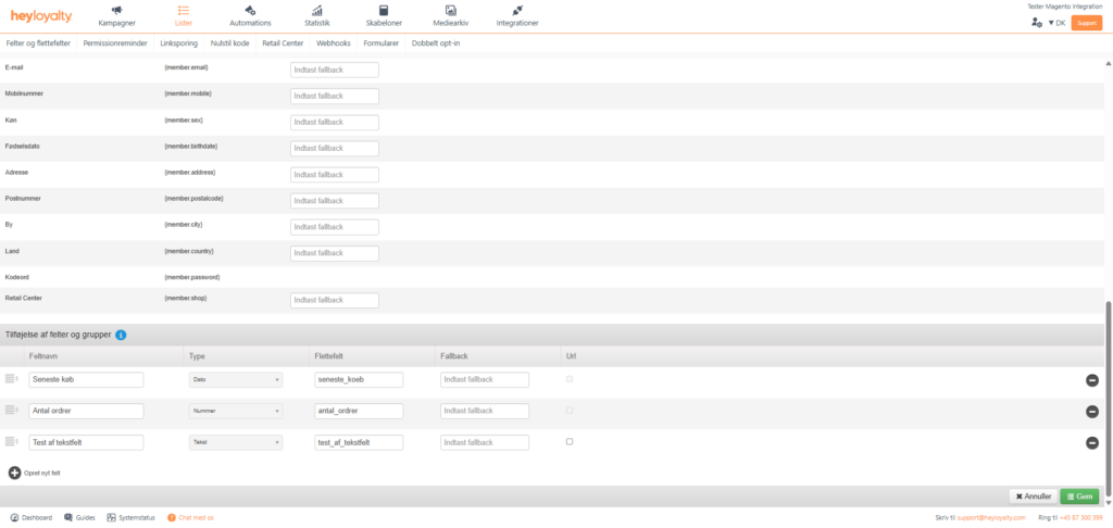 Lister –> ⁝ –> Redigér liste. Scroll ned i bunden og se alle de customfelter, der ligger på listen og som du har mappet som en del af integrationen.