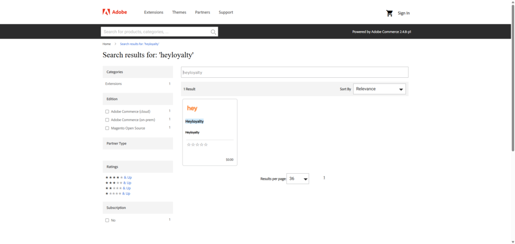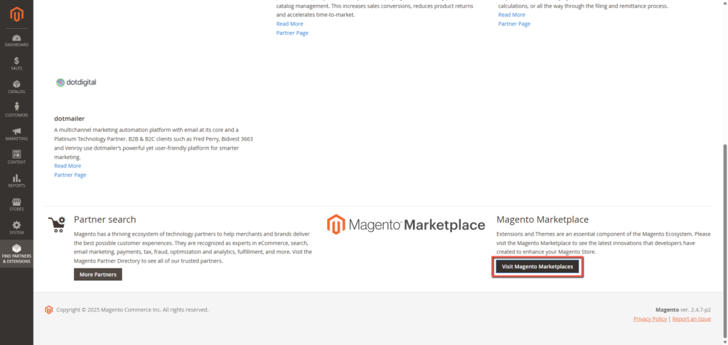 Find Heyloyalty-appen i Magento Marketplace. Log ind i Magento –> Find partners & extensions –> scroll ned i bunden og klik Visit Magento Marketplaces –> søg efter Heyloyalty.