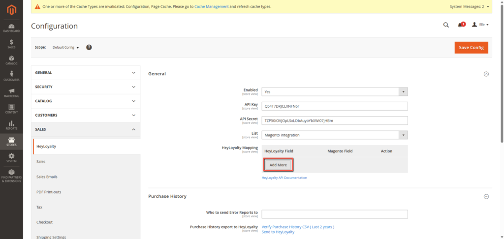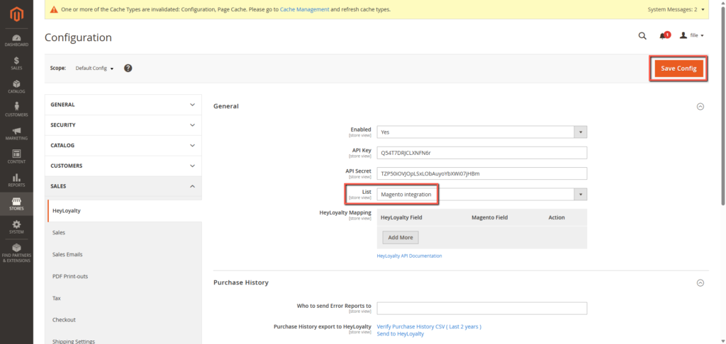 Tilbage til backenden i Magento klikker du nu på Stores –> Settings –> Configuration –> Sales –> Heyloyalty