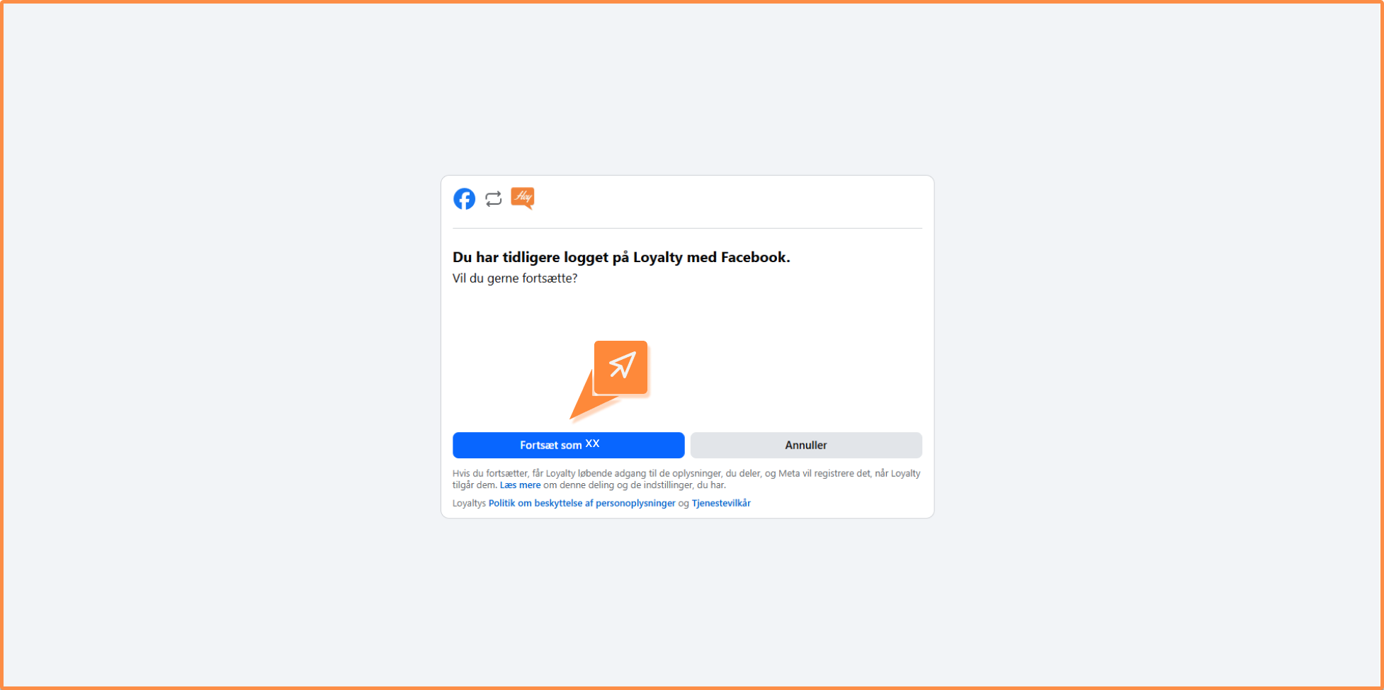 I Heyloyalty kan du nu klikke på Opret Meta integration. Efter du i foregående skridt klikkede Fortsæt som *dit navn* skulle du gerne være kommet tilbage til Heyloyalty. Alternativt kan du finde tilbage ved at åbne Heyloyalty og klikke Integrationer –> Listeintegrationer –> Meta – lead ads og audiences –> Rediger integration –> Opret Meta integration.
