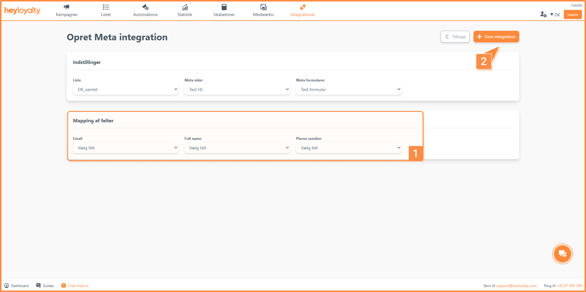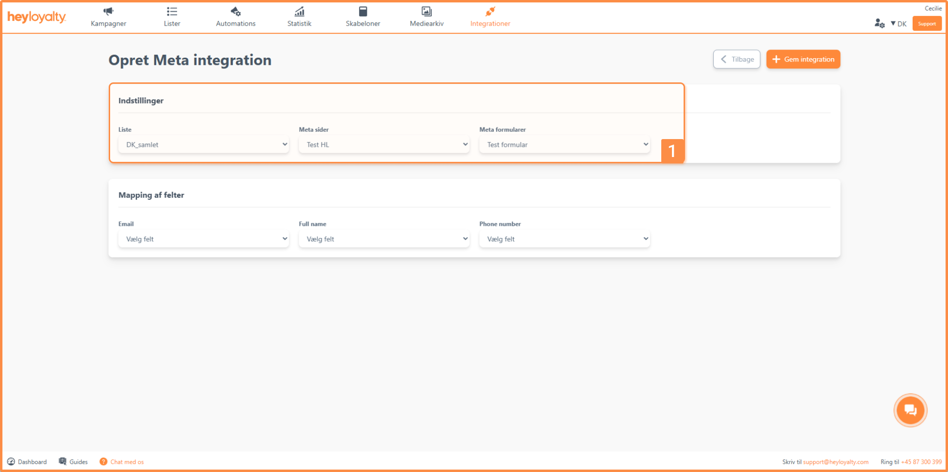 De felter, du kan se her, er de felter som bruges i den valgte formular fra Meta. De feltnavne du ser er navne fra Meta. Her skal du bestemme hvilke felter de skal mappes over i, som ses i dropdown. Når du er færdig med mappingen. Skal du trykke “gem integration”.