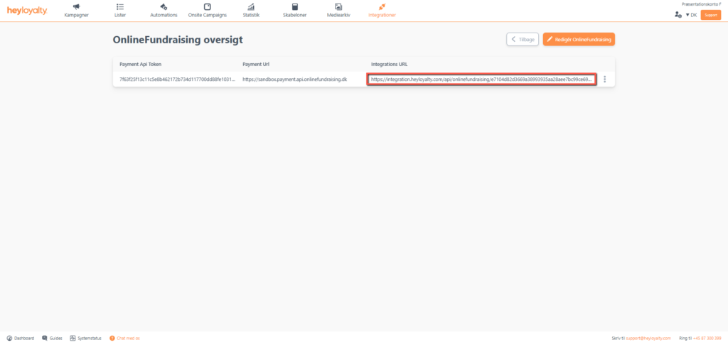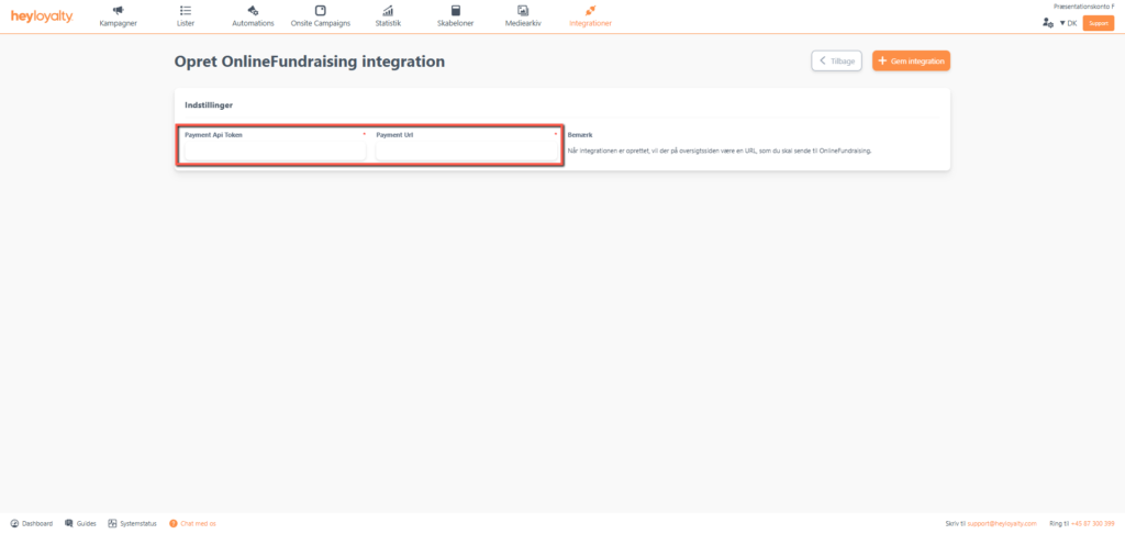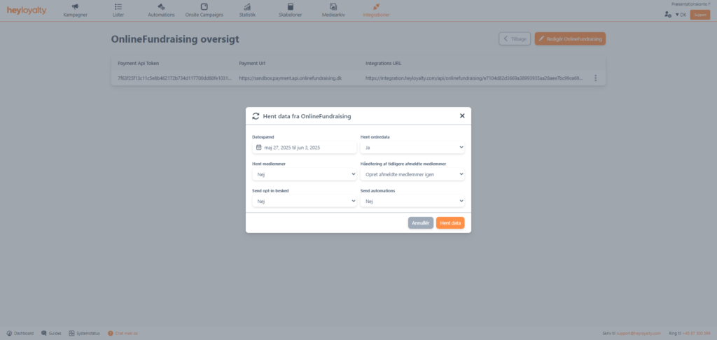 Med ovenstående forberedelse er du nu klar til at opsætte integrationen mellem OnlineFundraising og Heyloyalty.