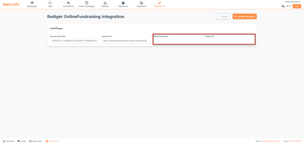 Indsæt nu DataSet Api Token og DataSet Url. Begge disse findes også under Settings i OnlineFundraising.