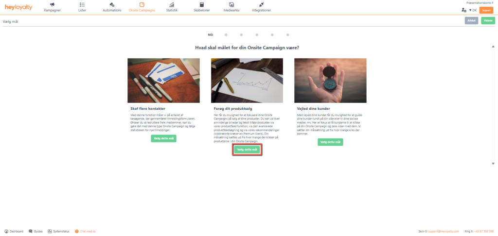 Der er flere forskellige typer af onsite campaigns. I denne guide fokuseres der udelukkende på Forøg dit produktsalg, hvorfor du skal vælge dette mål og efterfølgende er det oplagte valg pop upVælg denne type