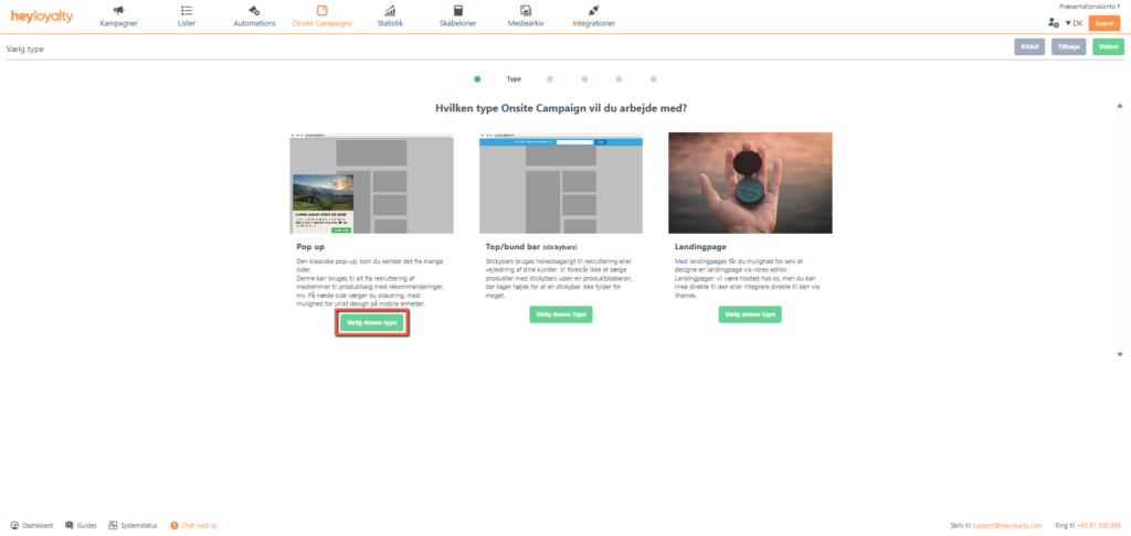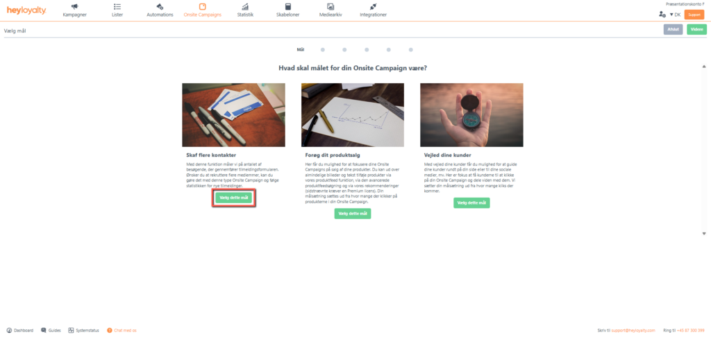 Der er flere forskellige typer af onsite campaigns. I denne guide fokuseres der udelukkende på Skaf flere kontakter, hvorfor du skal vælge dette mål og efterfølgende er det oplagte valg pop up; Vælg denne type.
