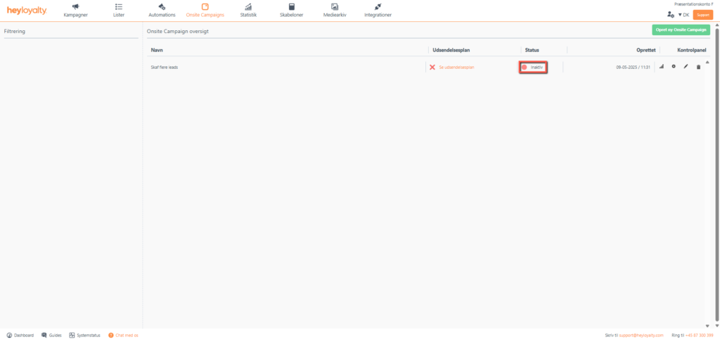 Du kan aktivere din onsite campaign ved at trykke på Inaktiv i kolonnen Status i din Onsite Campaign oversigt. Skriv Aktiver i feltet og klik på Aktivér