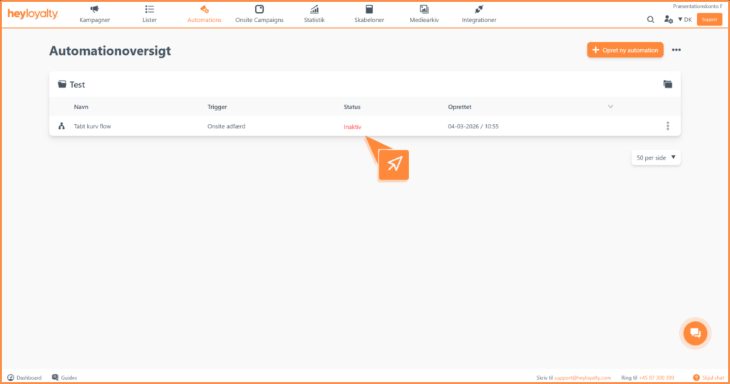 Efter du har designet din e-mail og gemt dit flow, kan du aktivere flowet ved at trykke på Inaktiv i kolonnen Status i din automationoversigt.