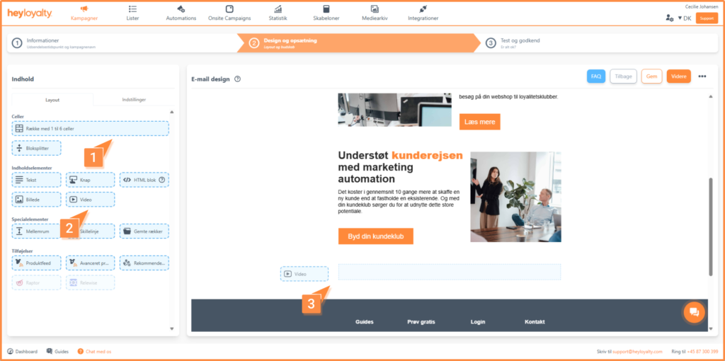På step 2, hvor du opbygger din e-mail, kan du indsætte et videoelement. Først skal du indsætte en celle i dit layout. Når cellen er på plads, kan du trække videoelementet ind i cellen: