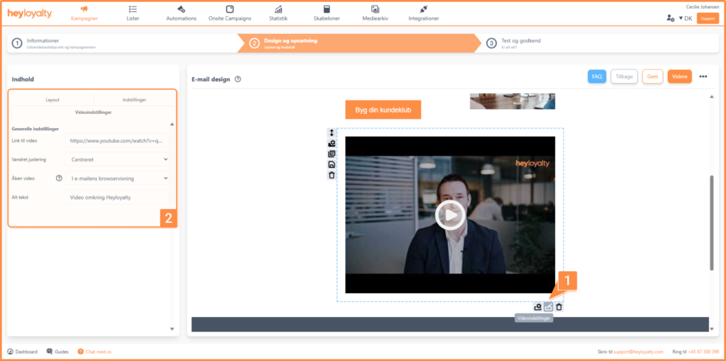 - Link til video: Indsæt URL’en til den video, du ønsker at vise. Videoen skal være hostet eksternt – eksempelvis på YouTube eller Vimeo. Det er ikke muligt at uploade video direkte til Heyloyalty.